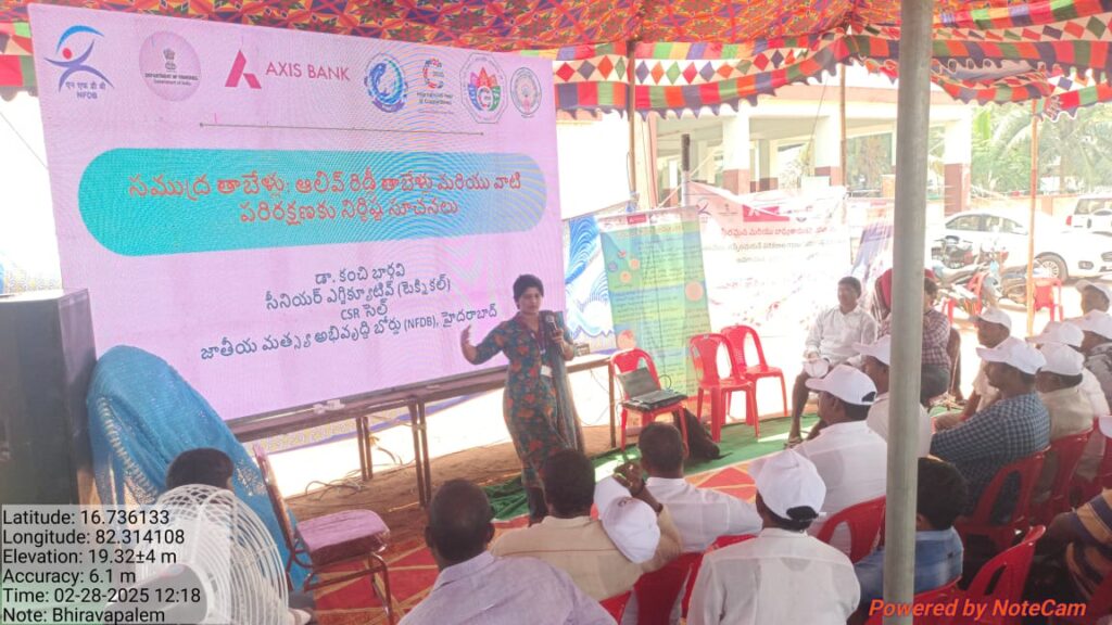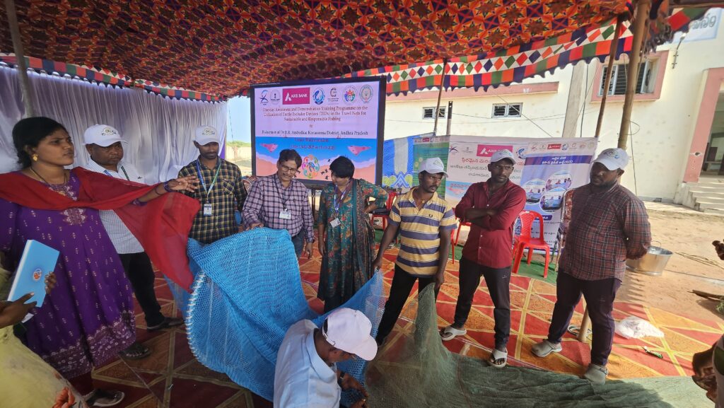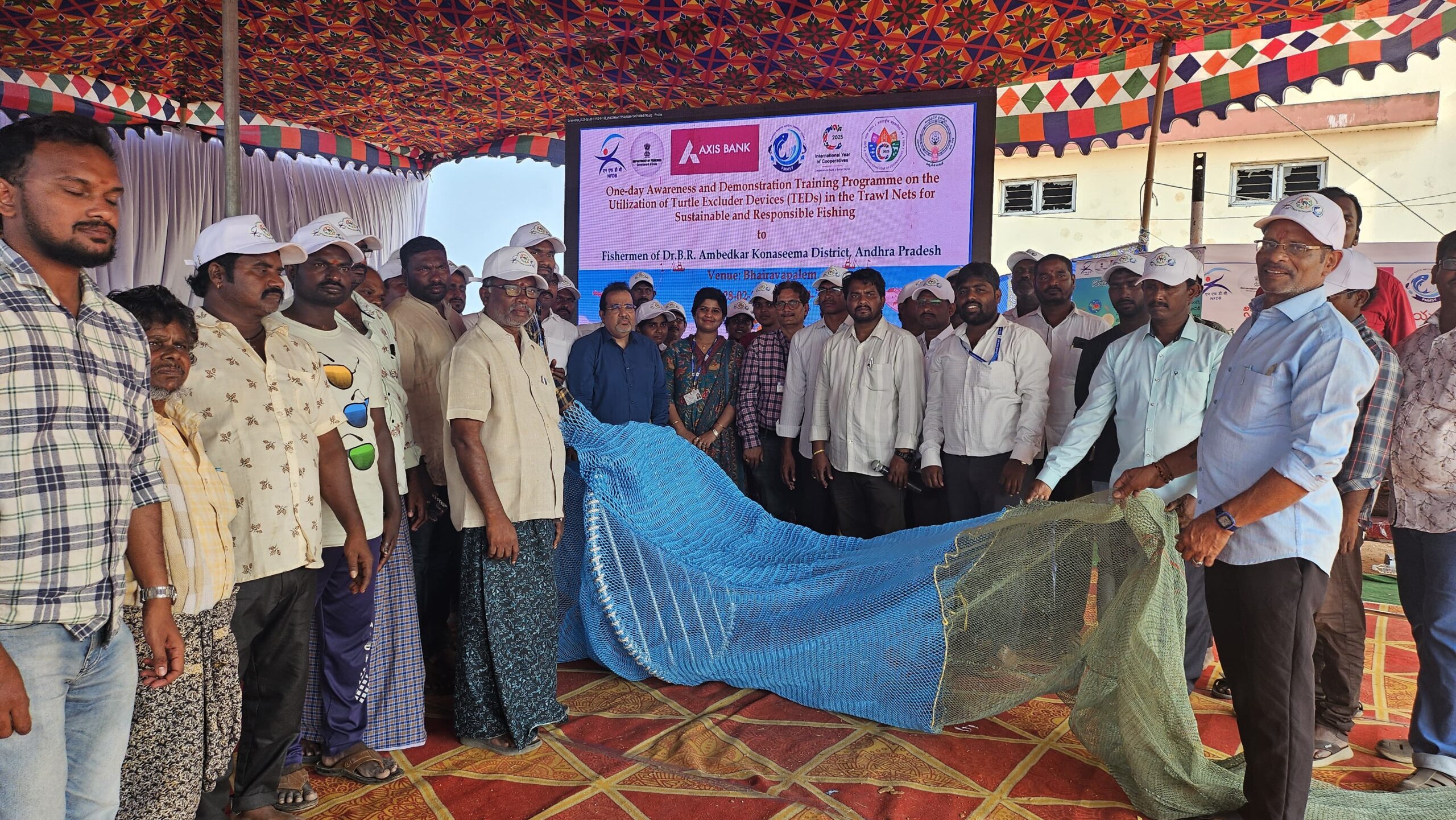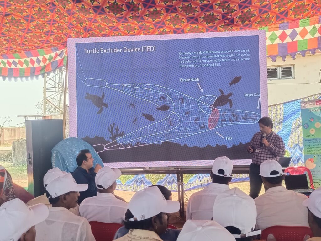 డాక్టర్ బి.ఆర్ అంబేద్కర్ కోనసీమ జిల్లా, ఐ పోలవరం మండలం, భైరవపాలెం గ్రామంలో తాబేలు తప్పించుకునే పరికరాల (TEDs) వినియోగం పై సదరు గ్రామంలో తుఫాన్ షెల్టర్ నందు సోనా బోట్ కలిగిన యజమానులకు మరియు వాటి యందు పనిచేస్తున్న కలాశీలకు సముద్ర తాబేలు సంరక్షణ, సుస్థిర చేపల వేట మరియు TEDs వినియోగం పై అవగాహన, పరిశీలన మరియు శిక్షణ కార్యక్రమమును ఏర్పాటు చేయడం జరిగింది. ఈ సముద్ర తాబేల్ల సంరక్షణ పై మన గౌరవ జిల్లా కలెక్టర్ ఆదేశాల ప్రకారం మత్స్యకారులకు TEDs వినియోగంపై అవగాహన కల్పించుటకు ఈ ప్రత్యేక కార్యక్రమంలో ఏర్పాటు చేయడం జరిగింది.