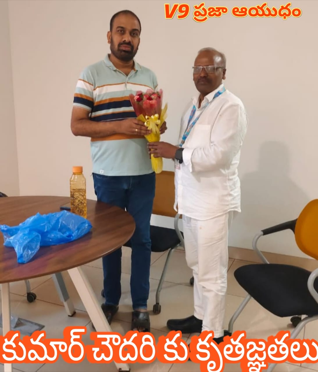 ఉమ్మడి ఆంధ్రప్రదేశ్ లో పేరుగాంచిన తెలుగు దేశం పార్టీ పొలిటికల్ చీప్ ఎనలిస్టు” కంప్యూటర్ (సాఫ్ట్వేర్) పై అపార పరిజ్ఞానం కలిగిన రాజకీయ విశ్లేషకులు,ప్రచారకర్త” కుమార్ చౌదరి ను V9 ప్రజా ఆయుధం దినపత్రిక ఎడిటర్ మరియు ఆ మీడియా సంస్థ చైర్మన్ వినయ్ కుమార్ సోమవారం మంగళగిరి లో కలిసి మర్యాదపూర్వకంగా పువ్వులు బుకే అందించారు.అనంతరం యోగక్షేమాలు అడిగి తెలుసుకున్నారు. ఈ సందర్భంలో వినయ్, ఆయన వద్ద మీడియాకు అవసరమైన కంప్యూటర్లో బహుళ ఆపరేటింగ్ సిస్టమ్స్(వర్చువలైజేషన్)గురించి తెలుసుకున్నారు.అంతేకాకుండా V9 ప్రజా ఆయుధం దినపత్రిక (న్యూస్ పేపర్) లేటెస్ట్ లోగో డిజైనింగ్ చూపించి మన్నలను పొందారు. మీడియా మాధ్యమాలు ద్వారా ప్రజలకు ఉపయోగపడే విధంగా ఉండాలని ఎనలిస్ట్ కుమార్ చౌదరి, వినయ్ కుమార్ కు సున్నితంగా అర్థమయ్యే రీతిలో సూచనలు సలహాలు ఇచ్చారు. ఈ సందర్భంగా ఆయనకు వినయ్ కృతజ్ఞతలు” మరియు “ధన్యవాదాలు” తెలిపారు.