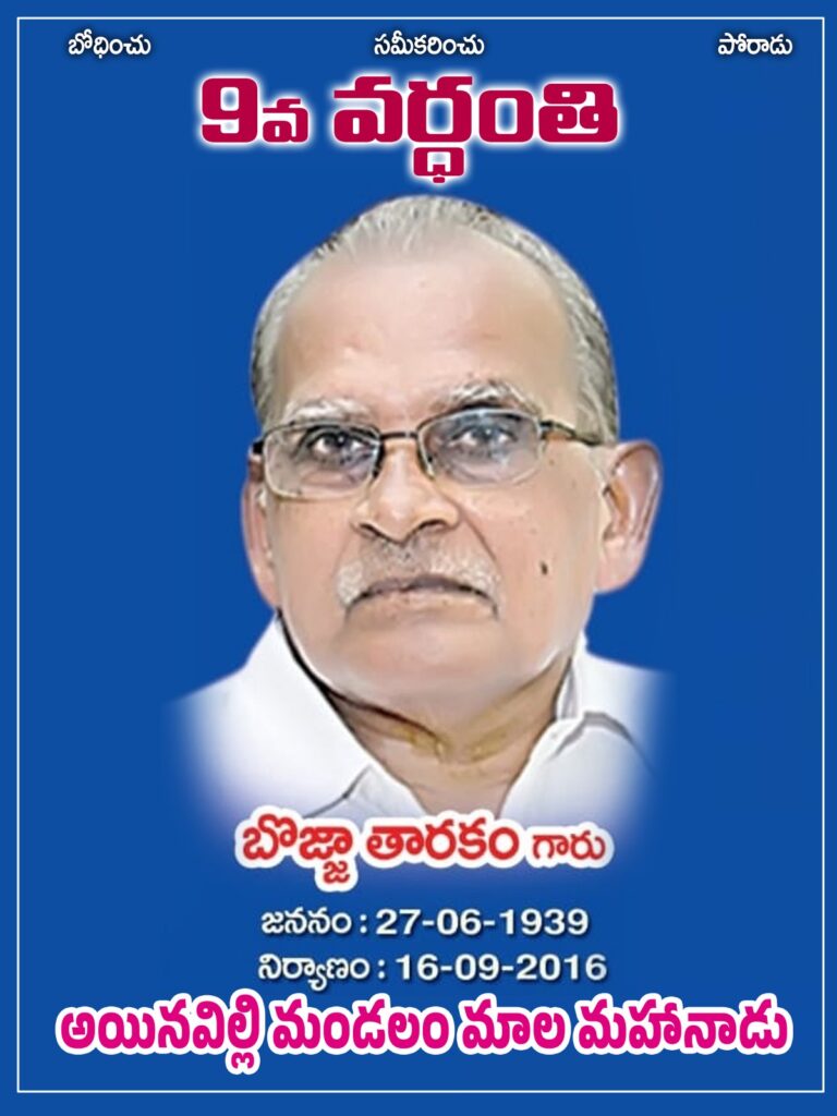 డాక్టర్.బి.ఆర్.అంబేద్కర్ కోనసీమ జిల్లా అమలాపురం నియోజకవర్గం స్థానిక కొంకపల్లి భూపయాగ్రహారం దగ్గర దళిత సేన ఆధ్వర్యంలో దళిత సేన అధ్యక్షుడు మెండి డేవిడ్ అంబేద్కర్ అధ్యక్షతన బొజ్జా తారకం వర్ధంతి కార్యక్రమం ఘనంగా నిర్వహించారు.తారకం చిత్రపటానికి పూలమాలలు వేసి నివాళులర్పించారు.డేవిడ్ అంబేద్కర్ మాట్లాడుతూ అణగారిన ప్రజల ఆశాజ్యోతి,దళిత,పౌర హక్కుల నాయకుడు,ప్రజా న్యాయవాది,రిపబ్లికన్ పార్టీ నాయకుడు,కవి, రచయిత గొప్ప వక్త బొజ్జా తారకం మన నుంచి భౌతికంగా దూరమై తొమ్మిదేళ్లు దాటింది. ఇంకా ఆయన స్ఫూర్తి సమాజంలోని పీడిత ప్రజల ప్రేమికులకు, ప్రగతిశీల శక్తులకు బాసటగా నిలుస్తూనే ఉంది. బొజ్జా తారకం 1939 జూన్ 27న డాక్టర్ బి.ఆర్ అంబేద్కర్ కోనసీమ జిల్లా కందికుప్ప గ్రామంలో బొజ్జా అప్పలస్వామి-మావుళ్ళమ్మ దంపతులకు కనిష్ట పుత్రుడిగా జన్మించారు. పుట్టుక నీది, చావు నీది, బతుకంతా ప్రజానీకానిది”అని కవి కాళోజి అన్నట్లుగా బొజ్జా తారకం విద్యార్థి దిశ నుంచి తుది శ్వాస విడిచే వరకు పీడిత ప్రజల అభివృద్ధి కోసమే పోరాడి ఒక ఉజ్వల చరిత్రను మన కళ్ళ ముందు నిలిపారు. ఆయన వెలుగులో జరిగిన పోరాటాలైన కారంచేడు, తిమ్మసముద్రం,పదిరికుప్పం, చుండూరు, లక్ష్మీదేవి పేట పోరాటాలకు అయిన నాయకత్వం వహించారు. సమాజంలోని ప్రగతిశీల శక్తుల సంఘీభావం సంపాదించారు. న్యాయస్థానాలలో ఆ సంఘటనలోని దోషులను శిక్షించే విధంగా నికార్సైన ఉద్యమ కారునుడిగా, పీడిత ప్రజల హక్కుల న్యాయవాదిగా అలుపెరగని పోరాటం చేశారు. ఒక వైపు న్యాయస్థానంలో ప్రజల వైపు నిలబడి అత్యంత నైపుణ్యంతో వాదనలు కొనసాగిస్తూనే, మరోవైపు అనేక ప్రజా పోరాటాలకు నాయకత్వం వహించారు. తారకం గారి 2014 లో బ్రెయిన్ ట్యూమర్ వ్యాధికి గురయ్యారు ఆఖరి క్షణంలో కూడా రోహిత్ వేములకు జరిగిన అన్యాయానికి వ్యతిరేకంగా ఇటు న్యాయస్థానంలోనూ,అటు ప్రజాక్షేత్రంలోనూపోరాడారు. సెప్టెంబర్ 16,2016 రాత్రి 9 గంటలకు తుది శ్వాస విడిచారు. తారకం మన మధ్యన భౌతికంగా లేకపోయినా పీడిత ప్రజల పట్ల ఆయన నిబద్ధత, ఆయన ఆచరించిన విలువలు, చేసిన న్యాయ, ప్రజా పోరాటాలు చిరకాలం సజీవంగా ఉంటాయని డేవిడ్ అంబేద్కర్ తెలిపారు.ఈ కార్యక్రమంలో వాకపల్లి హరీష్ కుమార్, సాపే రమేష్,బుసి రాంబాబు, గోసంగి సంతోష్,కమిడి సామ్యూల్ జ్యోతి,గోసంగి జాకోబ్ ప్రభు, కుమ్మరి రవితేజ,మాకే భవాని ప్రసాద్, మాదే విజయ్ కుమార్ తదితులు పాల్గొన్నారు.